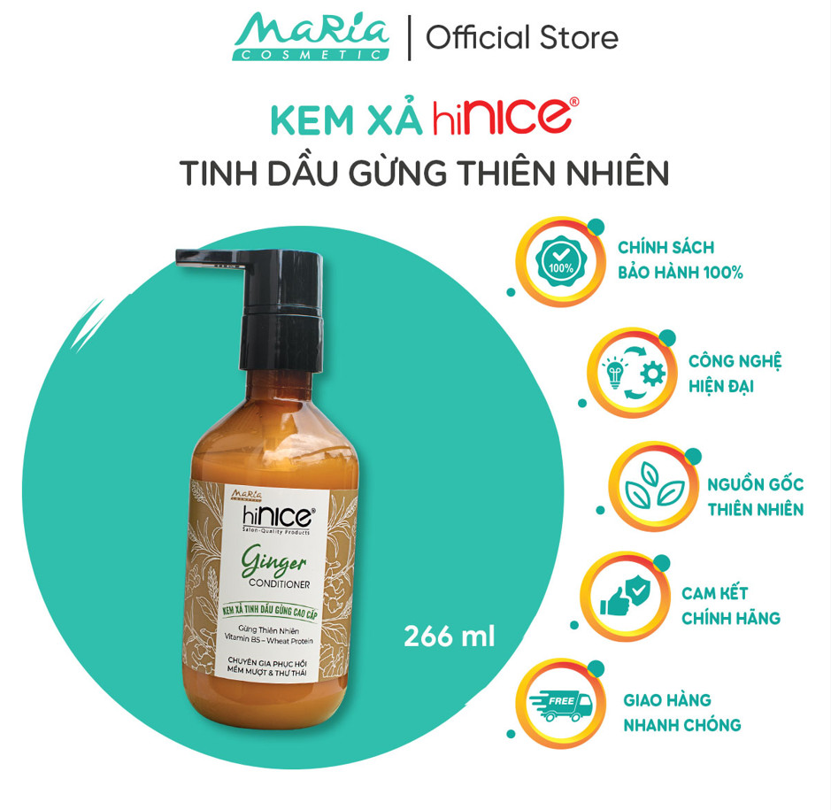 - Được chiết xuất từ tinh dầu gừng, kem xả tinh dầu gừng hiNICE có công dụng phục hồi tóc khô xơ, chẻ ngọn. Đồng thời, nuôi dưỡi tóc mềm mượt, sáng bóng hơn, bảo vệ cấu trúc tóc, tạo sự đàn hồi, chắc khoẻ.