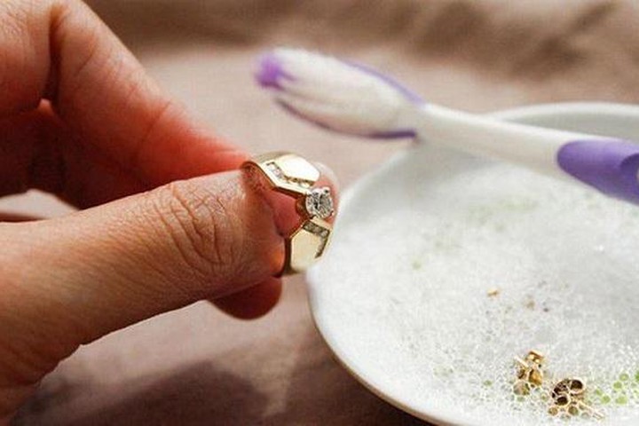 Trộn một hoặc hai giọt nước rửa chén vào một bát nước sạch sau đó thả đồ trang sức của bạn vào trong bát để chúng khoảng 5 phút. Sau đó hớt hết bọt phía trên và lấy đồ trang sức ra chà nhẹ nhàng với bàn chải mềm rồi rửa sạch đồ trang sức sẽ sáng bóng như mới.