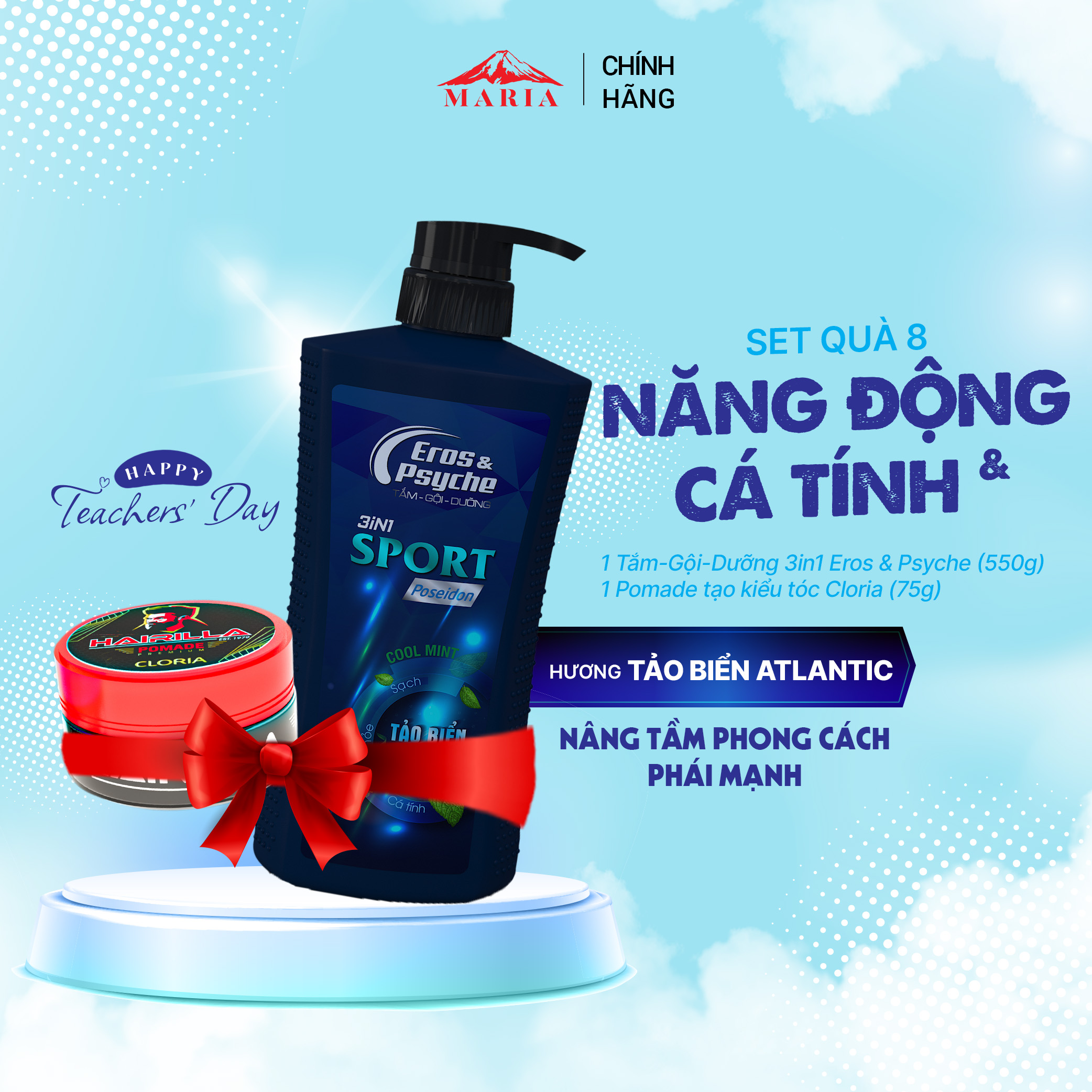 - 1 chai TẮM – GỘI – DƯỠNG 3IN1 Eros & Psyche: giúp sạch thoáng toàn thân, đầu tóc sạch thơm, da láng thoáng mịn cùng hương nước hoa nam cao cấp cùng hương tảo biển Atlantic mang đến cảm giác sảng khoái cho phái mạnh, sạch thoáng và tươi mát, bật hương CÁ TÍNH và NĂNG ĐỘNG suốt ngày dài.